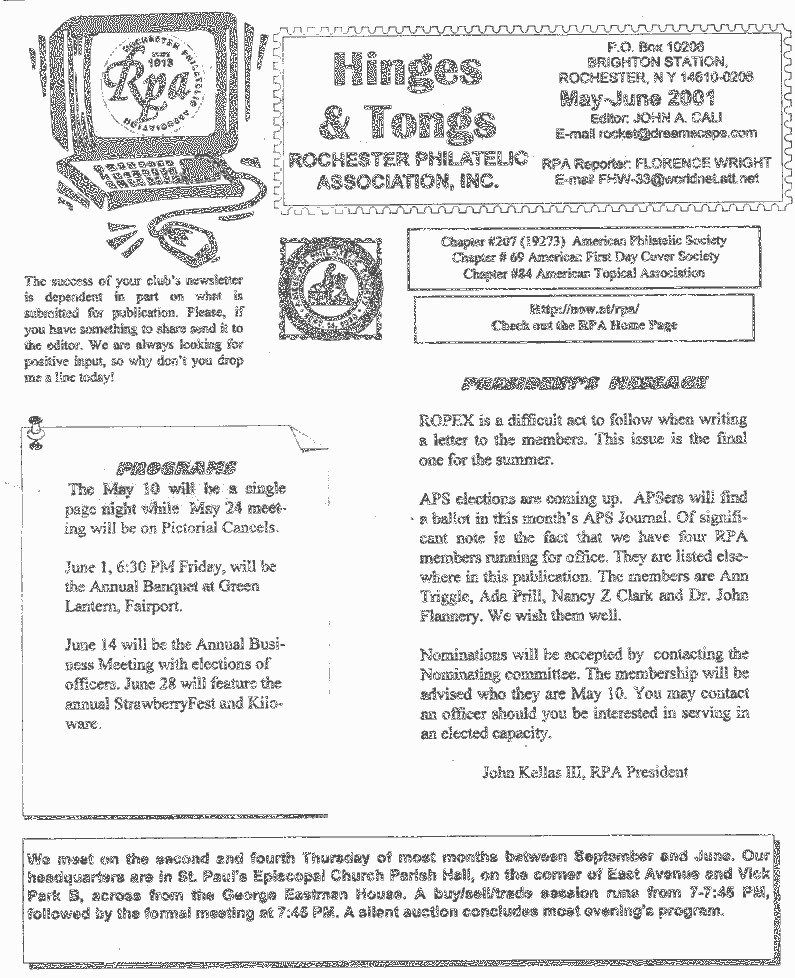 Whether you're a beginner or specialist, the RPA offers you many services and benefits. Our bimonthly newsletter, "Hinges & Tongs," is filled with articles about collecting in general and informs members about upcoming meetings and events. The club's philatelic library holds several hundred books, magazines and periodicals, including the most recent worldwide catalogs. These may be borrowed without cost by RPA members.